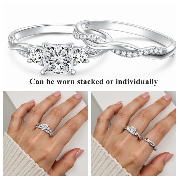 HOT ! Princess Cut Wedding Ring Sets for Women White Gold, 1-1/2 Carat(ctw) Moissanite Bridal Sets Platinum Plated Silver Engagement Ring Set Twisting Infinity Pave Set