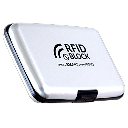 • This aluminum wallet blocks thieves from scanning the RFID tags on your cards.