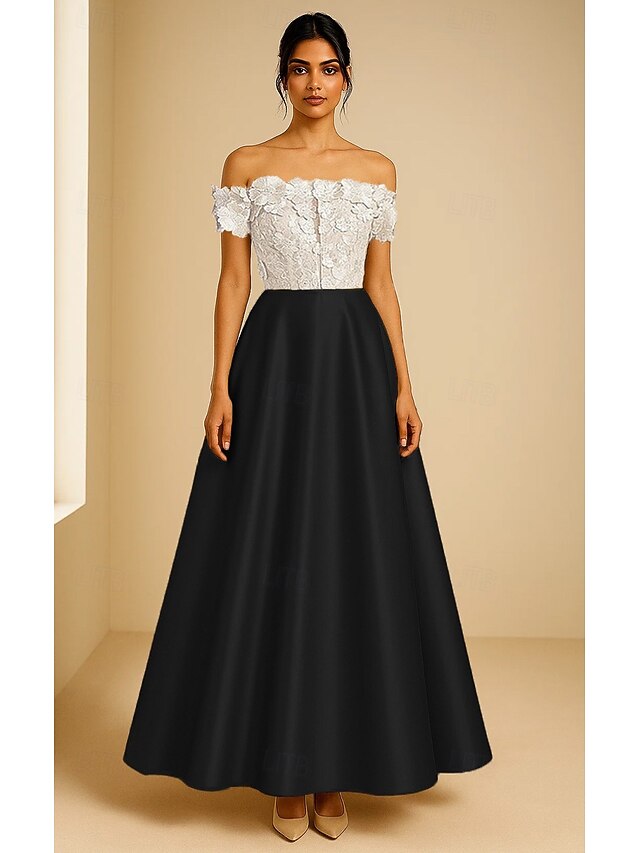 More information about Embroidered Floral Applique A-Line Evening Gown Elegant Formal Dress Formal Wedding Tea Length Off Shoulder Satin 2025