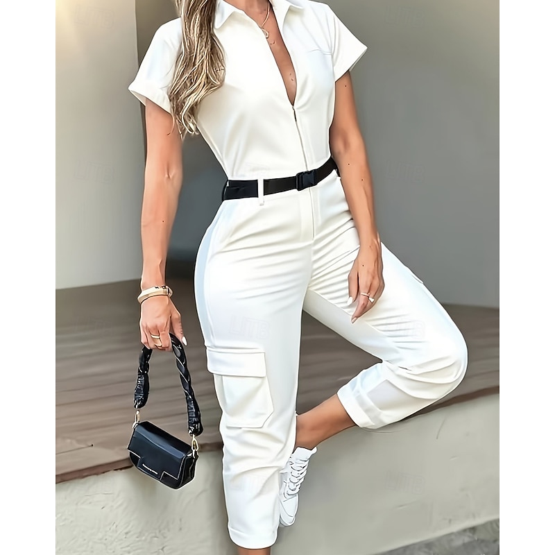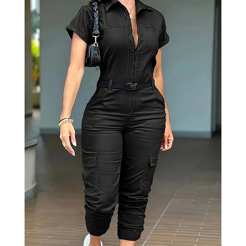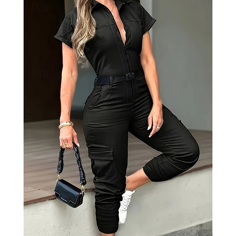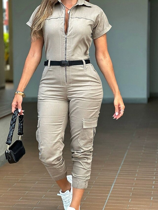 More information about Women's Normal Jumpsuit Streetwear Solid Color Short Sleeve Cargo Pants Shirt Collar Pocket Street Daily Regular Fit Black White Khaki Fall