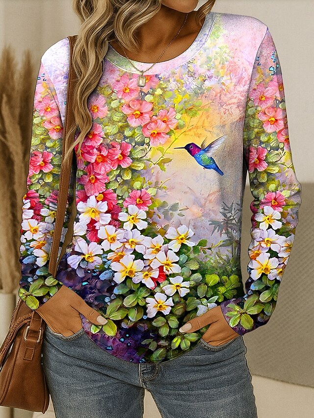 Women's T shirt Crew Neck Long Sleeve Tunic Floral Graphic Bird Vintage Stylish Classic  Round Neck Regular Tops Daily Weekend Print Yellow Red Blue Purple Green Fall 12