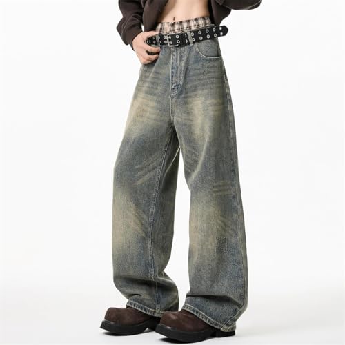 HOT ! Men's Distressed Vintage Jeans Loose Straight Fit Wide Leg Floor Length Denim Pants Streetwear Style