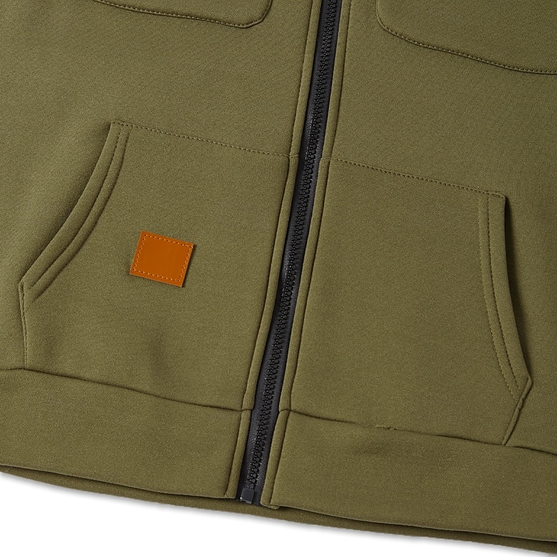 : Featuring a modern two-tone color scheme, this hoodie combines an olive green body with contrasting black sleeves and hood for a stylish, contemporary look. The jacket includes a convenient front zipper closure for easy wear and removal. Two large, functional chest pockets add a trendy utility touch and extra storage space, while a small leather patch detail at the waist adds a chic accent.