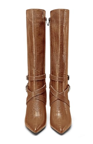 HEUIVZAR Womens Chunky Block Heel Pointed Toe Knee High Boots Dress Casual Zipper Buckle Mid Calf Boots 3.2 Inches Heels 5