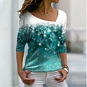 More information about Christmas Women's T Shirt Graphic Snowflake Vintage Stylish Basic Long Sleeve V Neck Off Shoulder Regular Tops Weekend Print Asymmetrical Red Blue Purple Green Winter Spring, Fall, Winter, Summer