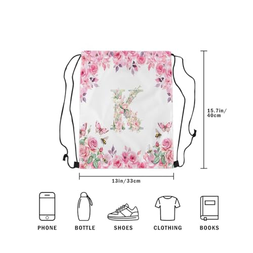 Erosebridal Initial A-Z Drawstring Backpack,13 x 15.7 inch Initial Letter K Drawstring Bag,Floral Monogrammed Draw String Back Bag,Romantic Rose Alphabet String Backpack for Sport Gym Swim 5