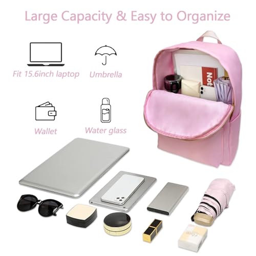 Nylon Backpack for Kids Teen Girls Boys, Waterproof Plain Bookbag Preppy School Bag Lightweight Travel Backpacks with Gold Zipper 15", Pink 7