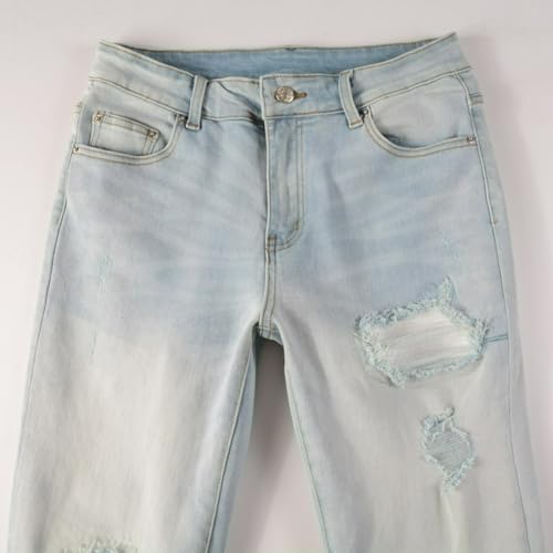 Jeans Pants Trousers Denim Men Street Trendy Stretch Fit Slim Piercing Patch Water Washed Blue Grinding Fading Edge Casual Small Foot(Light Blue,33) 7