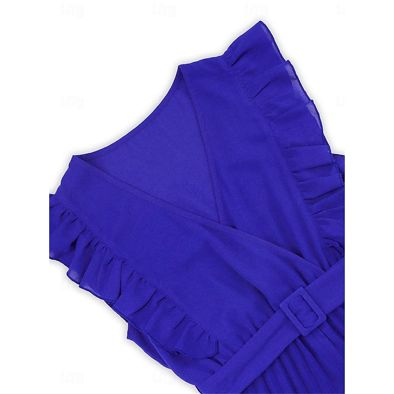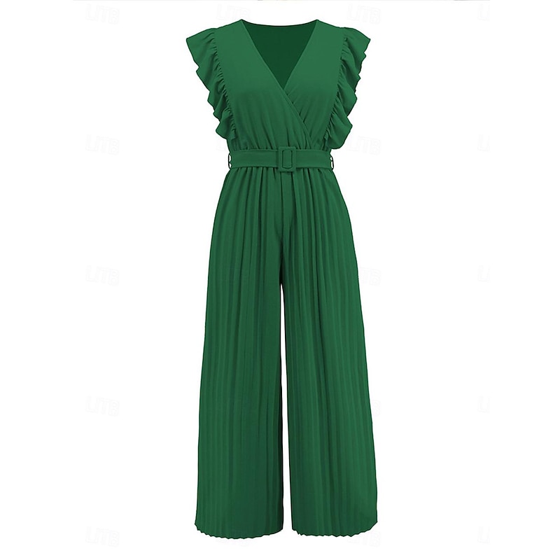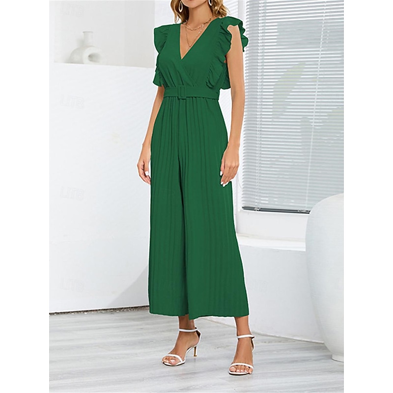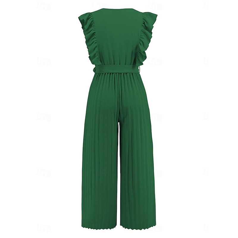 : Featuring a sophisticated V-neckline and charming ruffled detailing, this jumpsuit exudes feminine elegance. A high waistline cinched with a matching belt further defines the figure, adding a polished touch to the ensemble.