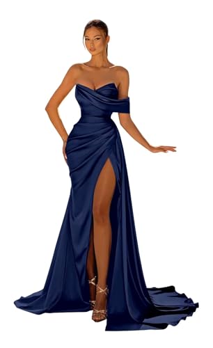 Long Mermaid Prom Dresses Satin with Slit Strapless Sweep Train Cocktail Party Formal Evening Gown 4