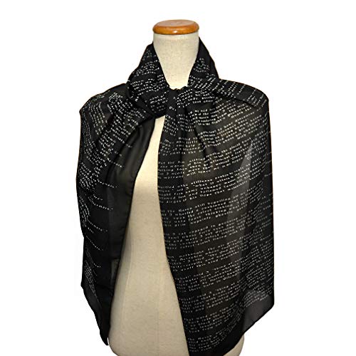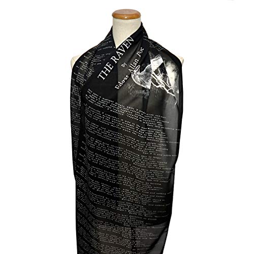 • A narrative poem "The Raven" written in 1845 by American writer Edgar Allan Poe FULL text of the poem printed on a soft, light, black colored poly chiffon scarf on both ends of the scarf and title page in the middle of the scarf.