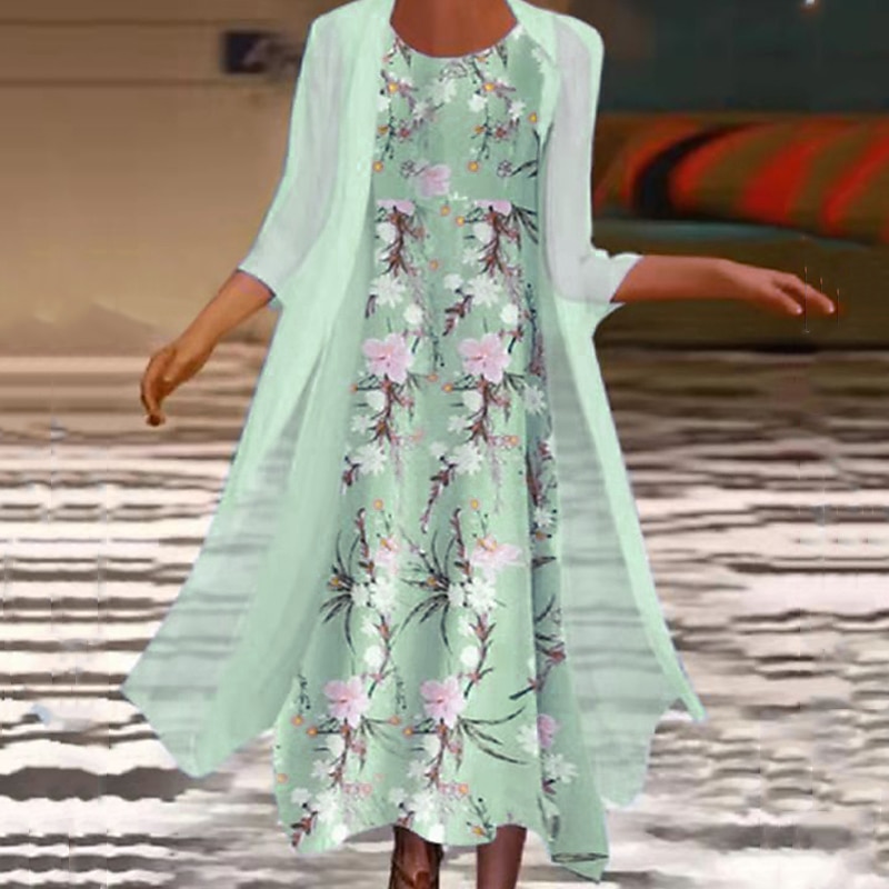 More information about Women's Midi Dress Two Piece Dress Set Dress Light Green Light Blue 3/4 Length Sleeve Floral Print Summer Spring Crew Neck Elegant