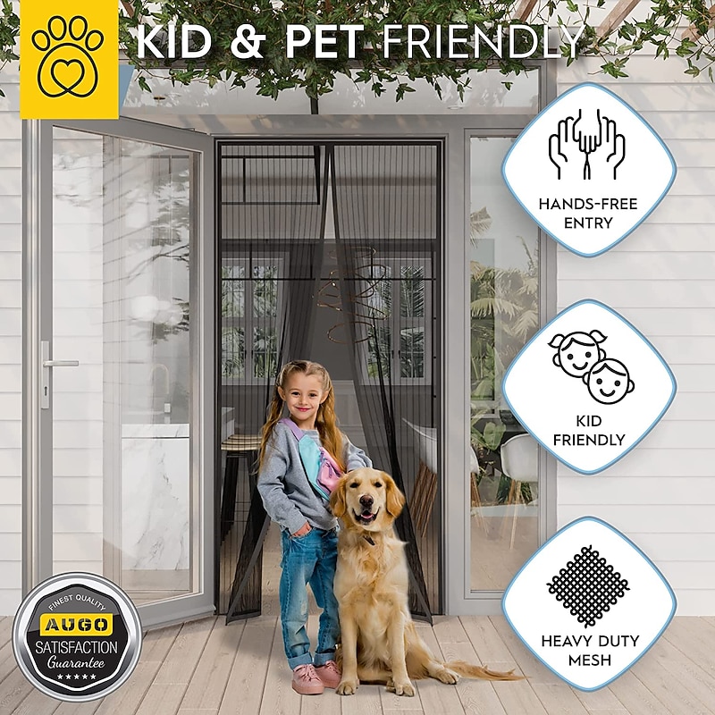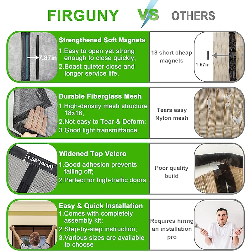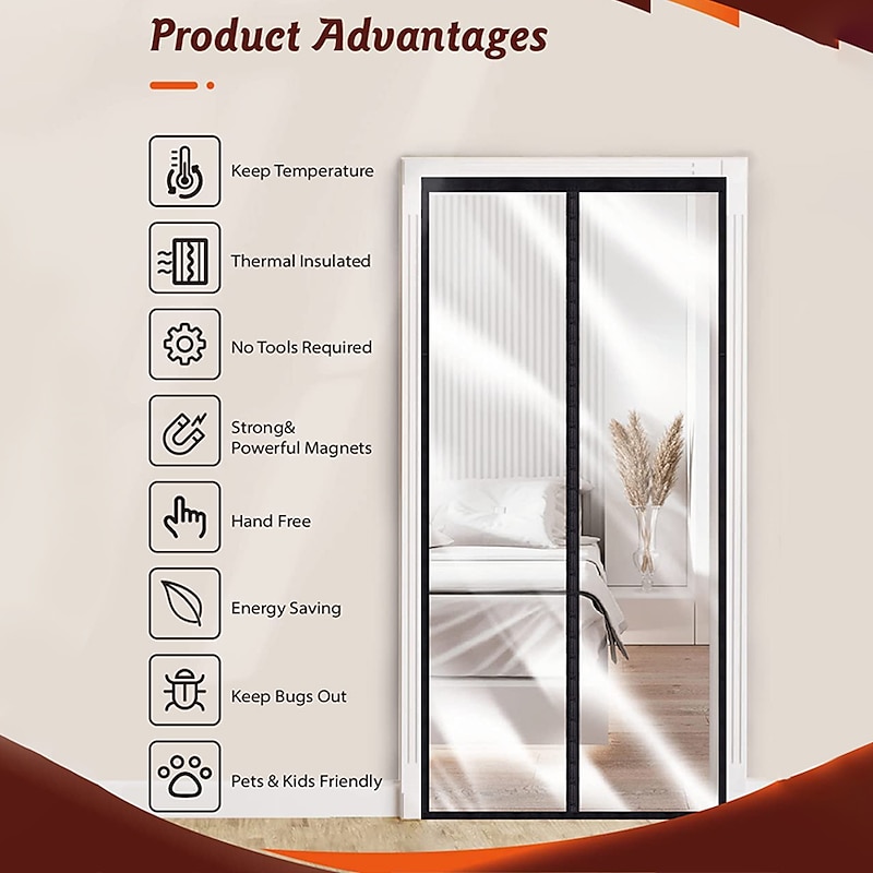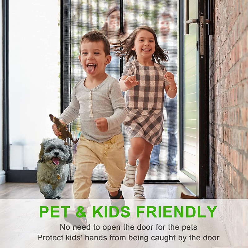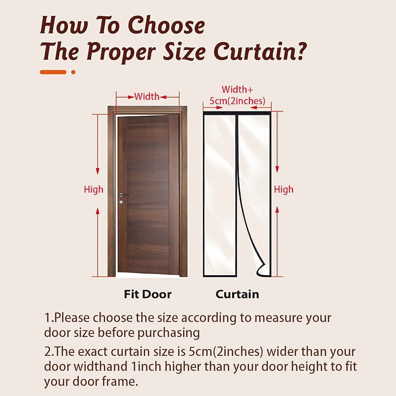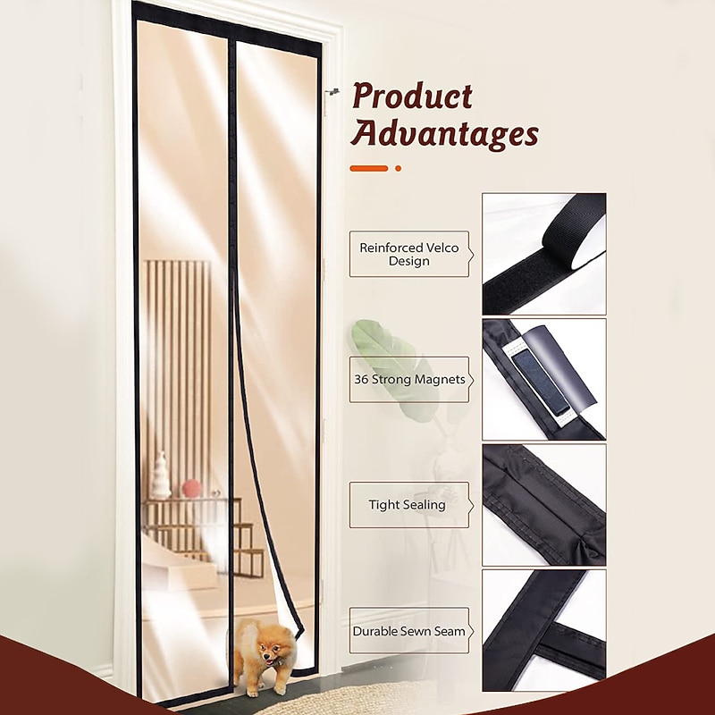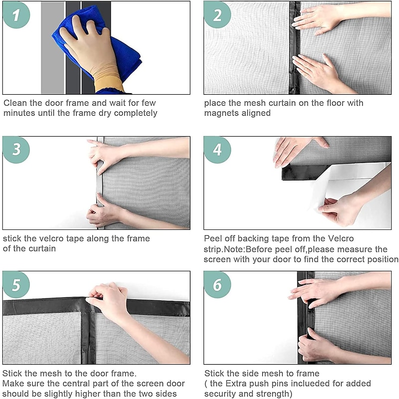 Highlights KID & PET FRIENDLY: Keeps bugs out, lets fresh air in. Dogs and cats can go inside and outside of the house with ease. EXCELLENT QUALITY: doorway curtains feature EVA ECO-Friendly material, Soft and durable, easy to clean, and without any harmful substances; The mid-seam lining is upgraded with 36 magnets, tested thousands of times for wind resistance rating, for a better seal, and the widened Velcro allows you to fix the curtains more stably. Instruction Steps: 1.Clean the door frame and wait a few minutes until the cleaning area is completely dry. 2.Cut the backing strip from the hook and loop strip.Strip the white backing tape and attach the magic tape to the frame from top to bottom. 3.Lay the mesh flat on the floor. Install the supplied magic tape strip on the top and on each side, stick the mesh to the top of the door frame. 4.The needs to be fixed around the door during installation and can be adjusted if necessary.You can also choose to use the push pin to provide extra support in the wooden door frame.