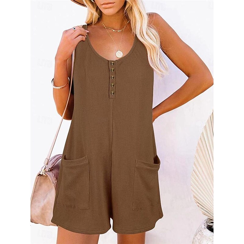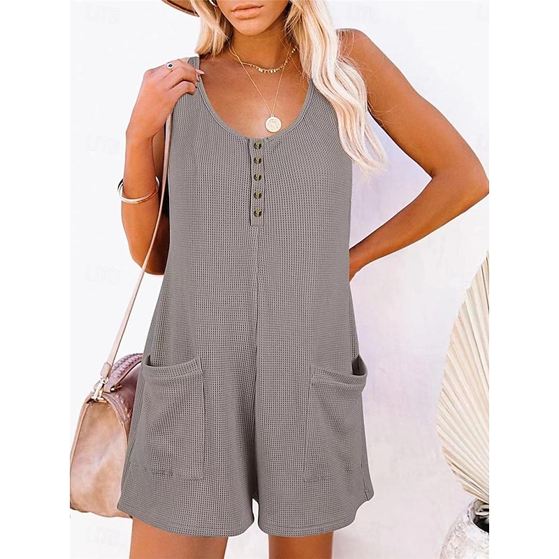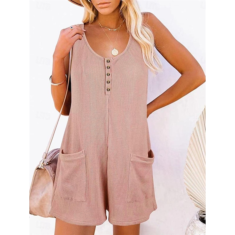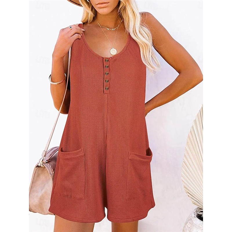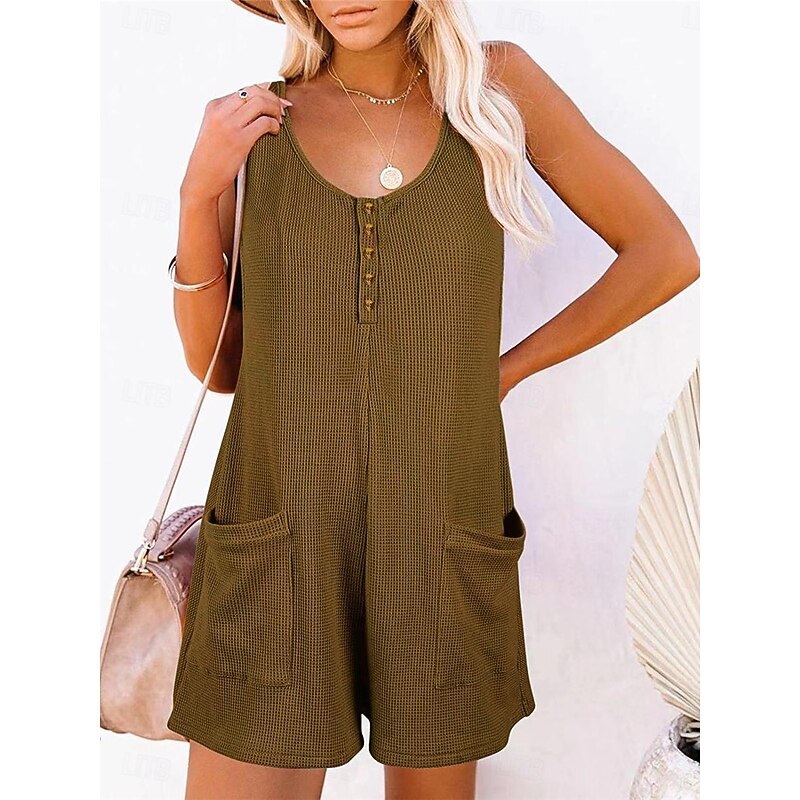 : Featuring a V-neckline with a partial button placket, this romper exudes casual elegance. The addition of practical front pockets enhances its functionality while maintaining a laid-back vibe.