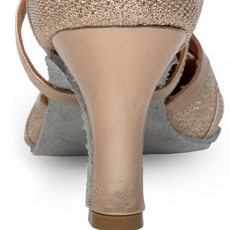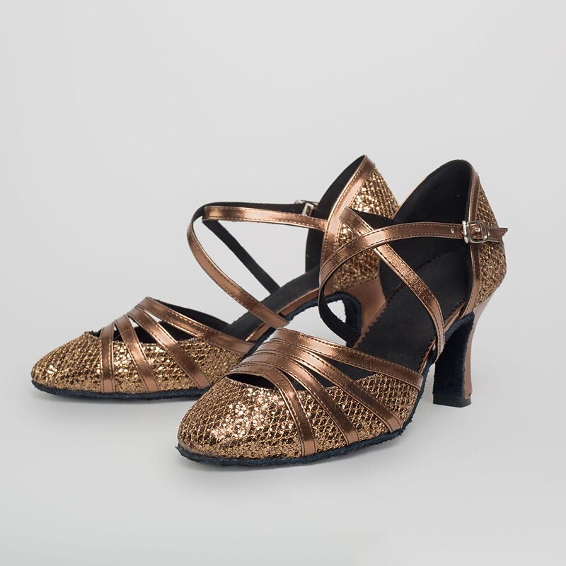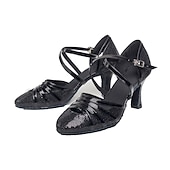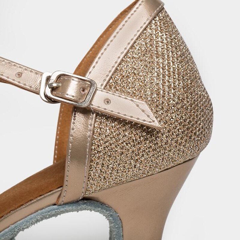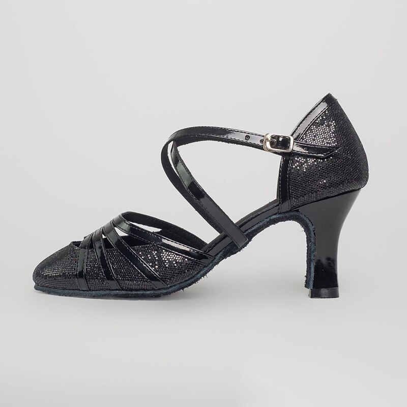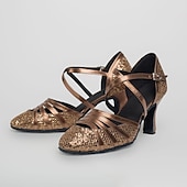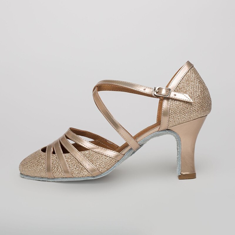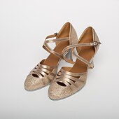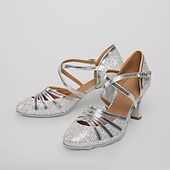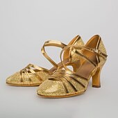 Highlights [Fabric and Finish] : Crafted from high-quality PU leather with a sparkling glitter finish, these women's ballroom dance shoes combine durability with a touch of glamour. The shimmering surface beautifully catches the light, ensuring you'll stand out on the dance floor. [Fit and Style] : Featuring a secure, cross-strap design with an adjustable buckle, these shoes provide an elegant look and a snug fit. The flared heel type offers the ideal combination of style and stability, perfect for those long dance sessions. [Design Highlights] : The shoes boast a dazzling glitter and splicing embellishment that adds a modern flair. Designed with a mid-height heel, they provide an eye-catching, sophisticated appearance suitable for various dance styles. [Occasions] : These modern ballroom dance shoes are perfect for professional stages, indoor performances, and waltz events. Whether you're a seasoned performer or a dancing enthusiast, these shoes are ideal for showcasing your moves. [Size Range] : Available in a wide range of sizes from 34 to 41, accommodating different foot sizes and ensuring a perfect fit for every dancer.