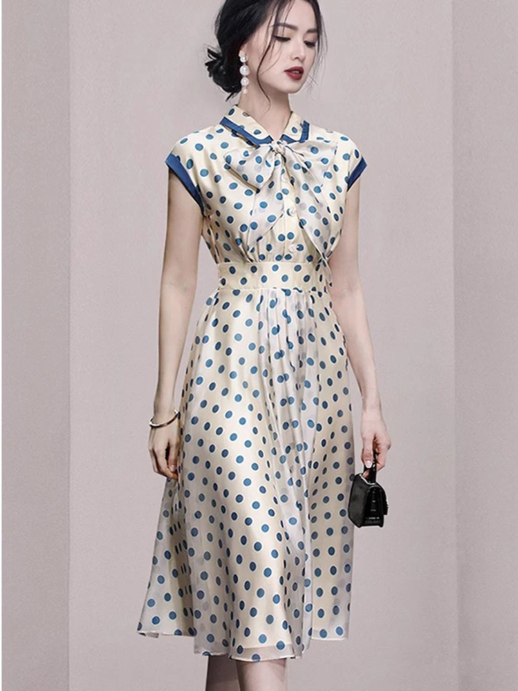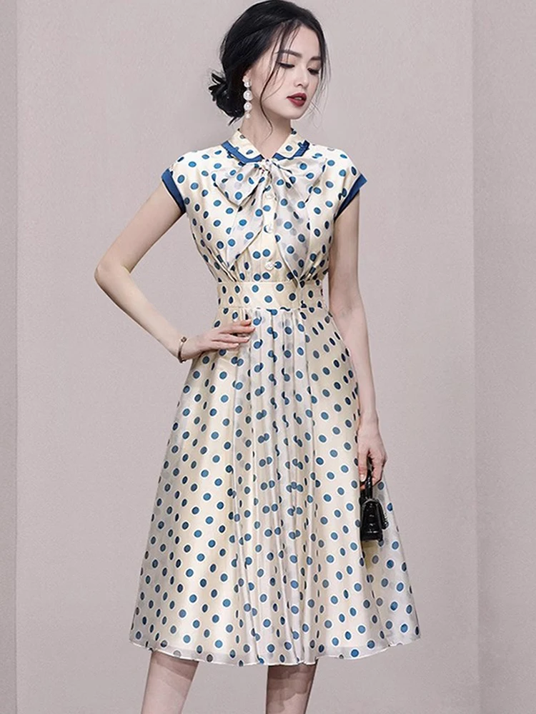 Fashion Temperament Dresses For Women Polka Dot Print Short Sleeve Summer Bowknot Slim A-Line Knee Length Party Dress Vestidos