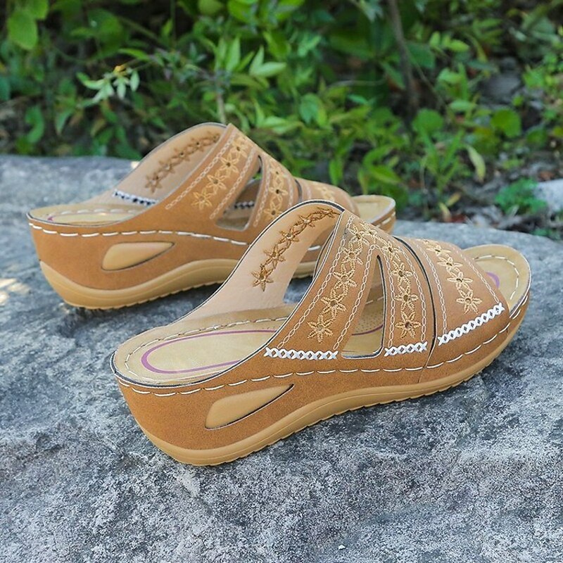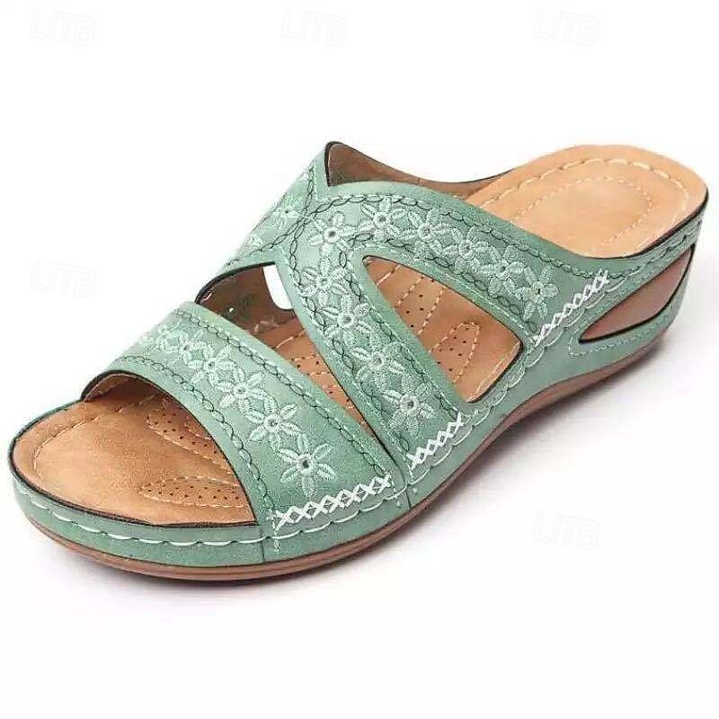 Highlights [Fabric] : Crafted with premium PU material, this pair of women's slippers offers a soft texture that mimics the look and feel of suede. The material ensures durability and a comfortable fit for everyday wear. [Style] : Featuring a wedge heel, these slippers provide a subtle lift without compromising on comfort. The open-toe design allows for breathability, making them perfect for warm weather outings. [Design Highlights] : These slippers showcase intricate floral embroidery in contrasting white thread, adding a touch of elegance and detail. The central panel is thoughtfully designed with cut-out sections to enhance breathability and comfort. [Occasions] : Ideal for outdoor adventures, casual strolls, and relaxed gatherings, these slippers are versatile enough to be worn for various occasions. Whether it's a weekend getaway or a leisurely day out, they offer style and ease. [Size Range] : Available in a broad range of sizes from 35 to 43, ensuring a comfortable fit for various foot shapes. The diverse color palette includes Black, Brown, Blue, and Pink, catering to different style preferences.