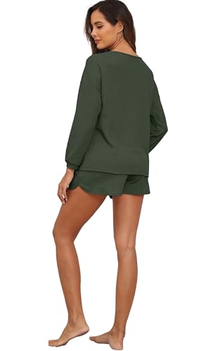 • Features: The casual lounge set features a pullover top with a flattering v neckline, offering a casual yet chic look. The loose fit and solid color of this cute long sleeve waffle top provide both comfort and versatility. It stretches to fit all body shapes, making it an ideal choice. Complete the set with our matching shorts for women, designed with a soft elastic waistband and a convenient drawstring for a customized and comfortable fit