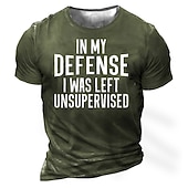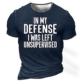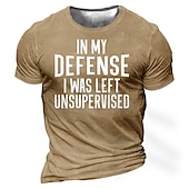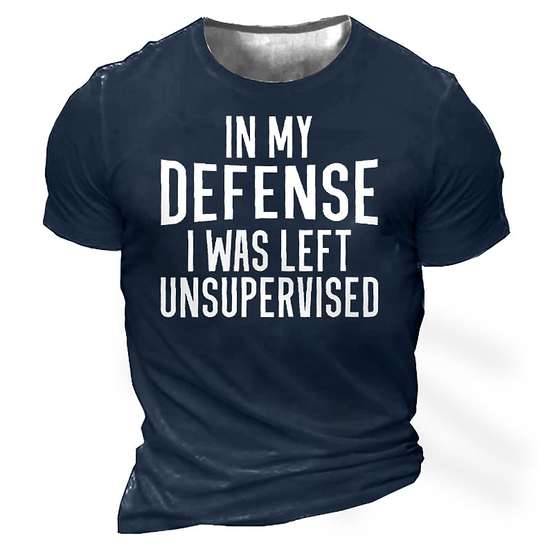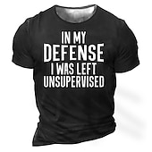 Highlights [Fabric] This men's plus size t-shirt is crafted from a high-quality polyester fabric that provides a micro-elastic, comfortable, and breathable fit, making it ideal for daily wear during the summer months. [Fit] Designed with a regular fit, this t-shirt offers both style and ease of movement, perfect for big and tall individuals. The crew neck and short sleeves contribute to its versatile and timeless appeal. [Design Highlights] The standout feature of this t-shirt is its eye-catching 3D graphic print with a humorous letter design saying "IN MY DEFENSE I WAS LEFT UNSUPERVISED." This clever print adds a playful touch to your casual wardrobe. Available in a variety of colors like Black, Dark Gray, Navy Blue, Army Green, and Khaki, the t-shirt is sure to fit any personal style. [Occasions] Perfect for a variety of occasions, this t-shirt is suitable for street wear, holidays, daily activities, and outdoor events. Whether you're lounging at home or heading out for a casual outing with friends, it adds a stylish twist to any outfit. [Size Range] This t-shirt is available in plus sizes, ranging from XL to 5XL, catering to the needs of big and tall customers and ensuring a comfortable fit for everyone.