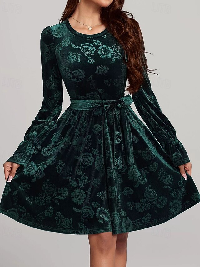 HOT ! Women's Midi Dress Velvet Dress Cocktail Dress Elegant Fashion Modern Outdoor Party Party Evening Wear Regular Fit Floral Plain Long Sleeve Crew Neck Dark Green Spring Winter Autumn