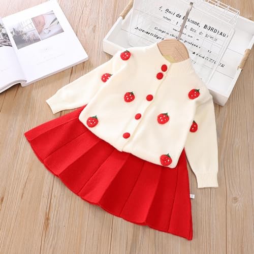 HOT ! Toddler Girls Sweater Outfits Strawberry Embroidered Knit Cardigan & Pleated Skirt Set Baby Cute Knit Sweater A Line Skirt