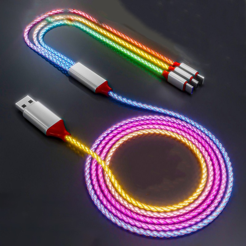 HOT ! 3-IN-1 6A 66W RGB Super Fast Charging Cable Type-C Micro USB Charger Cable Flow Cool Colorful Glow Data Line For iPhone Android