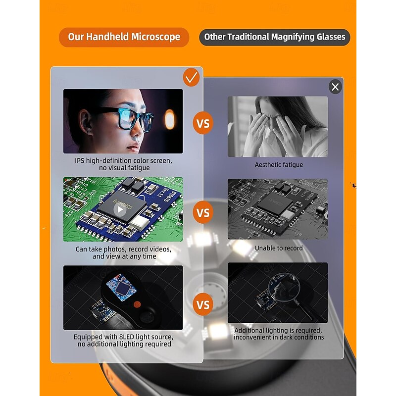 Why Choose Digital Microscope Handheld 2.0 inch IPS Color Screen,Portable Digital Magnifying Glass 500x,Marco Microscope for Kids,Built-in 8LED Lights,USB Compatible with PC Windows, Mac OS?