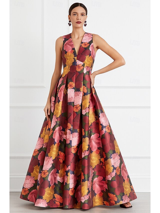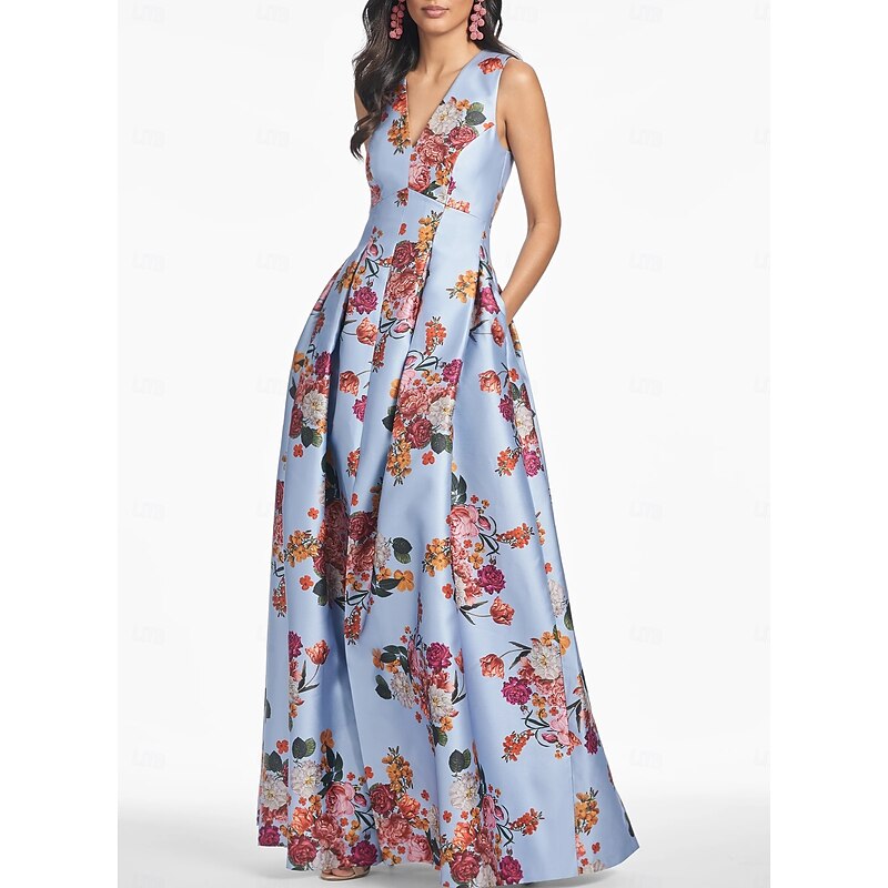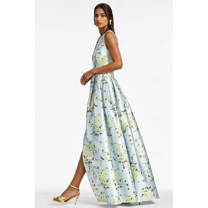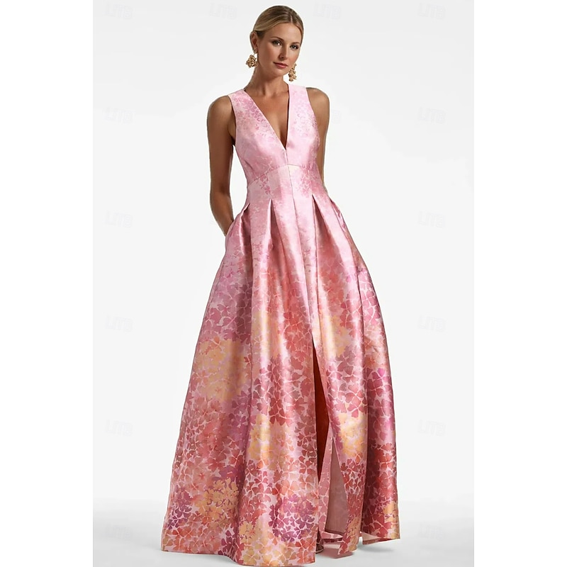 HOT ! A-Line Evening Gown High Split Dress Beach Wedding Formal Wedding Guest Floor Length Sleeveless V Neck Pocket Satin with Floral Print Slit Pocket Race Day Dress Wedding Guest Dress