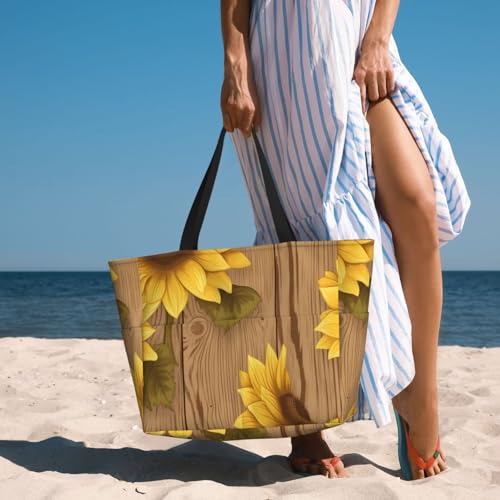 HOT ! (Sunflower Printed) Large Beach Tote Bag For Women With Zipper Foldable Lightweight Travel Pool Bag For Vacation Shopping