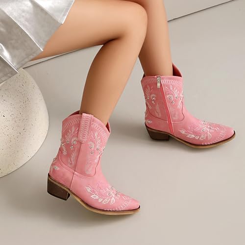 Women's Cowboy Ankle Boots Western Booties with Sparkly Rhinestone Low Heel 4