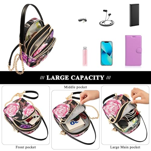 HOT ! Watercolor Pink Purple Peonies over Shoulder Handbags Lady Cell Phone Purse Chain Strap Floral Print Zipper Bowler Tote Ladies Satchel, 5.9" × 8.3" × 3.1"