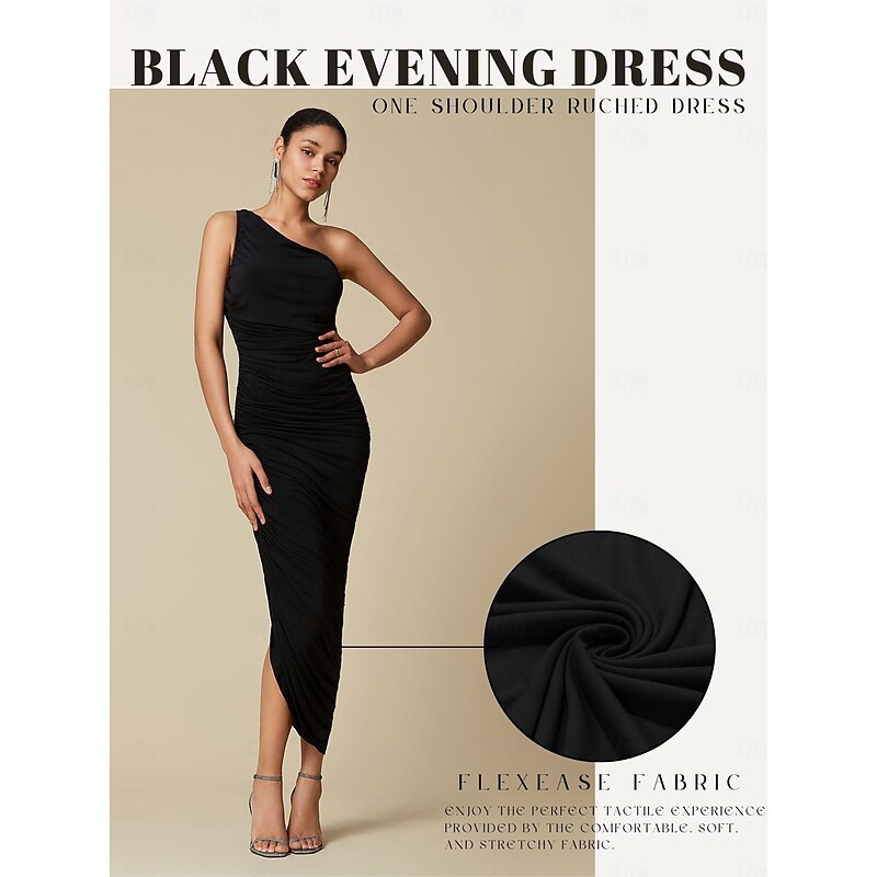 Highlights [Fabric] Expertly crafted from a high-quality blend of spandex and polyester, this elegant midi dress offers a smooth and luxurious feel. The fabric's high elasticity ensures a comfortable and flattering fit, perfect for highlighting the body's natural curves. [Silhouette] This dress features a maxi length with a regular fit design, offering a sophisticated and figure-enhancing silhouette. The slim fit style accentuates elegance while maintaining comfort and ease of movement. [Design Highlights] Showcasing a chic one-shoulder neckline, this dress combines modern style with classic elements. The ruched detailing along the bodice and skirt adds depth and texture to the overall design, creating a refined and polished look. [Occasions] Ideal for a variety of occasions, this black dress is a versatile piece that suits birthday celebrations, club gatherings, beach vacations, and more. Its simple yet elegant style makes it a perfect choice for party wear, ensuring you stand out with effortless sophistication. [Sizes] Available in a range of sizes from S to XXL, this dress is designed to cater to a variety of body types, providing a flattering and stylish option for many.