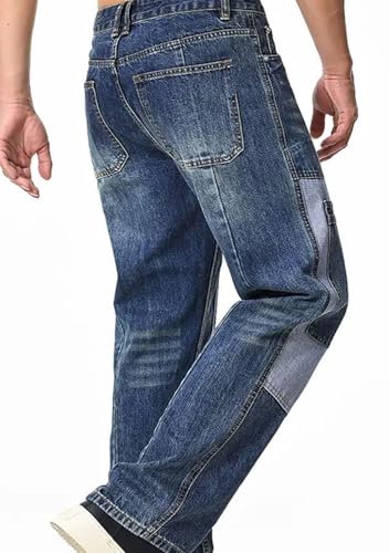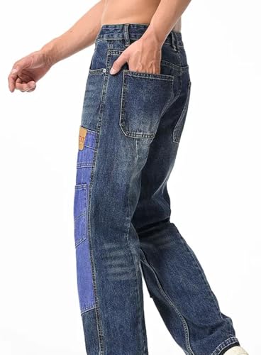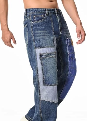 More information about Men’S Retro High Street Patchwork Loose Fit Wide Leg Denim Jeans Zipper Fly Midweight Embroidery Full Length Trendy Jeans