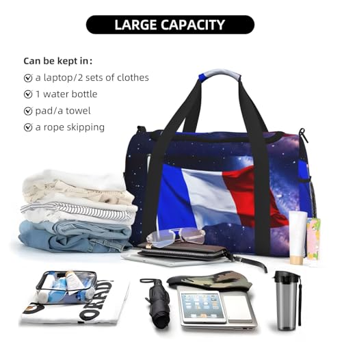 • ThisFrench flag Print travel duffle bag measures 50x33x26 cm (19.7x13x10.2 inches), offering ample space to accommodate clothes, electronics, and daily essentials. for weekend getaways, gym workouts, or even as an airplane carry on.