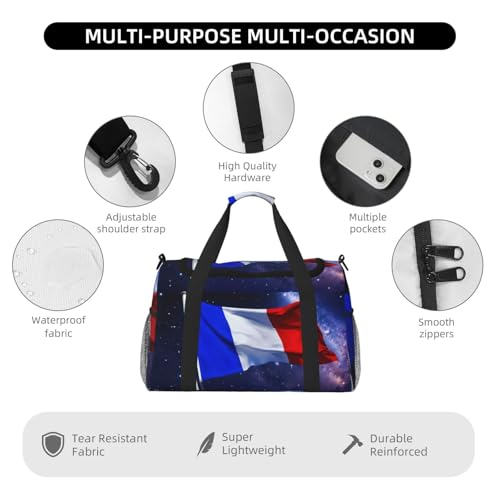 • With one main compartment, an internal zip pocket, a detachable shoulder strap adjustable between 70-120cm, and two side mesh pockets, thisFrench flag Print versatile travel bag offers multiple storage options. Reinforced side straps add extra and stability.