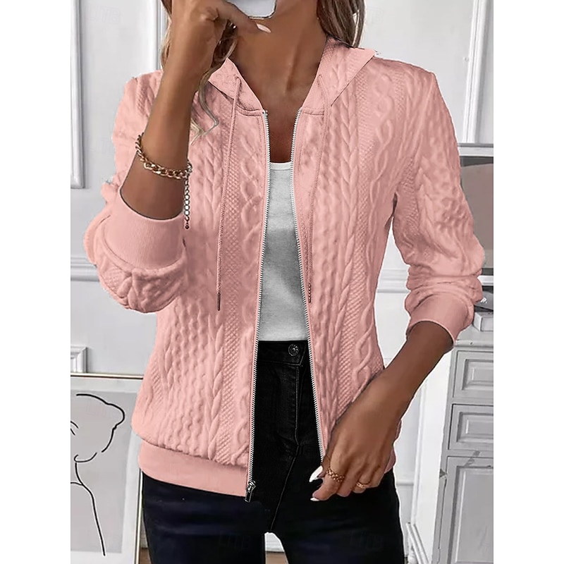 Highlights [Fabric] : Crafted from high-quality polyester, this women's jacket combines warmth and a chic aesthetic. The micro-elastic fabric ensures a comfortable fit, making it suitable for all-day wear across multiple seasons including spring, fall, and winter. [Fit] : The regular fit design offers a balanced silhouette that flatters various body types, ensuring both style and comfort. The jacket includes long sleeves and a lapel neckline, enhancing its classic appeal. [Design Highlights] : Featuring a full-length zipper closure and a drawstring hood, this jacket provides a customizable fit and added convenience. The ribbed cuffs and hem introduce a structured element, while the solid color pattern adds to its versatile character. [Occasions] : Perfect for casual and daily wear, this jacket is a versatile addition to your wardrobe. Whether you're heading out for a weekend gathering or simply taking a casual stroll, its stylish design makes it suitable for various informal occasions. [Size Range] : Available in a wide range of sizes including S, M, L, XL, and 2XL, this jacket caters to different body shapes and preferences, ensuring everyone can find their ideal fit.