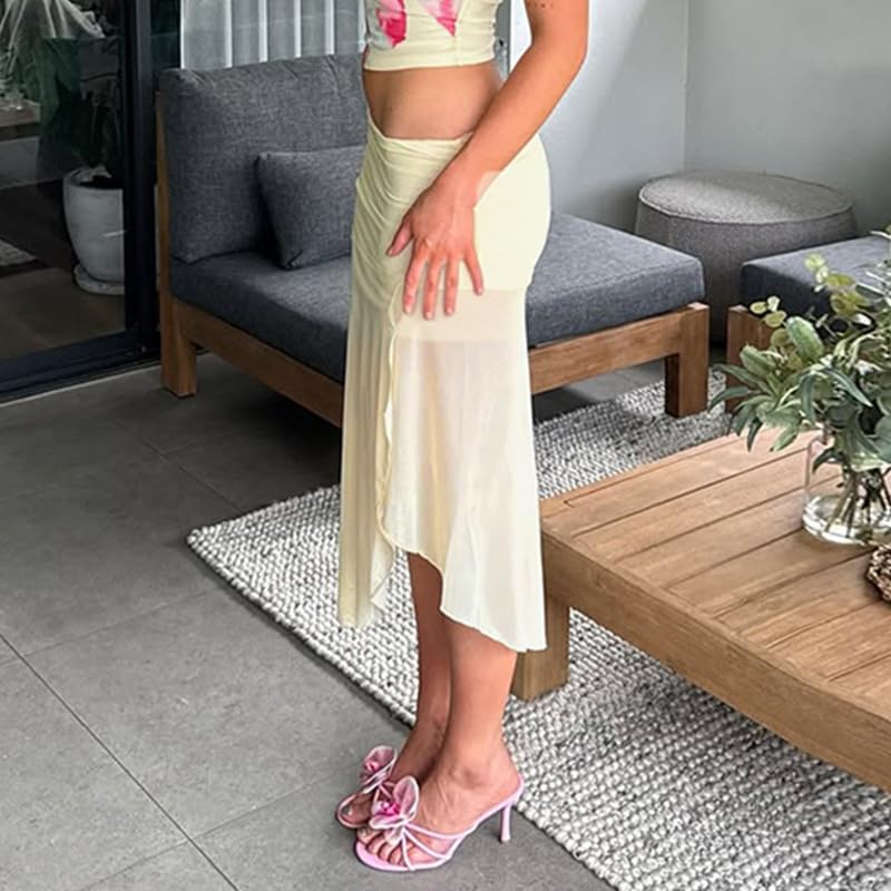 Wuitrie Summer Skirts for Women 2025 Vacation Low Waist Slim Pleated Skirt Irregular Flowy Long Gauze Skirt 1