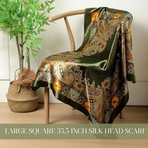 HOT ! SATINIOR 35 Inch Silky Head Scarf 2 Pcs Large Square Neck Scarf Sleeping Hair Wrapping Satin Bandana for Women(Army Green,Delicate Style)