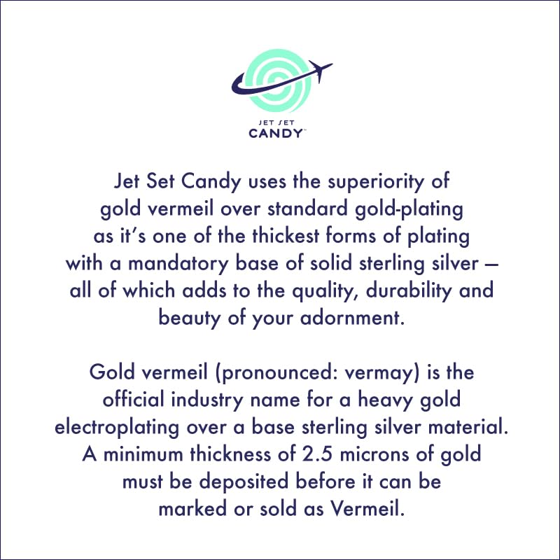 • Jet Set Candy uses the superiority of gold vermeil as it's one of the thickest forms of plating. Gold vermeil (pronounced: vermay) is the official name for a heavy gold electroplating over a base of sterling silver. A minimum thickness of 2.5 microns of gold must be deposited before it can be marked or sold as Vermeil.