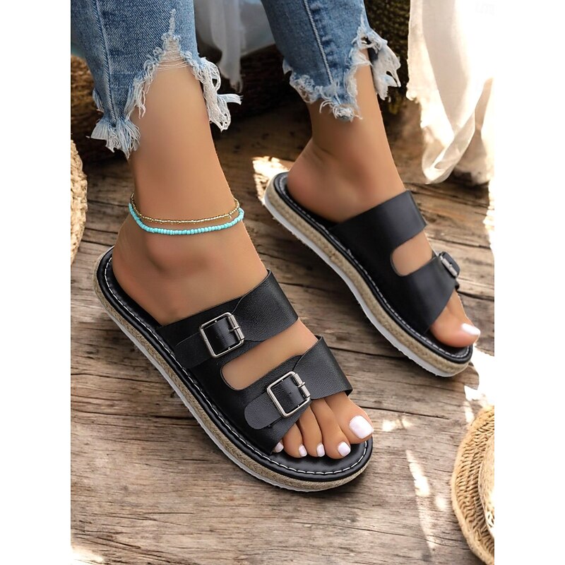 HOT ! Black Faux Leather Platform Sandals with Buckle Strap for Women – Casual, Comfortable, and Trendy Summer Footwear