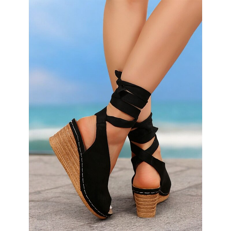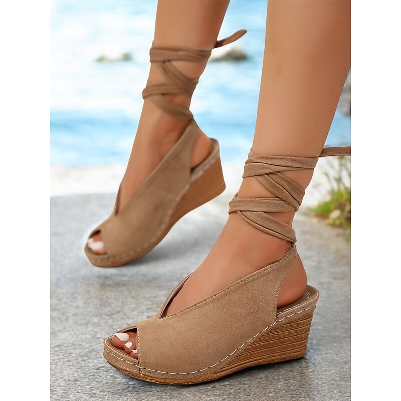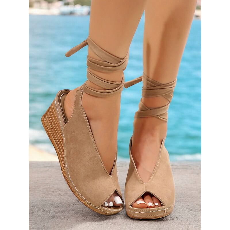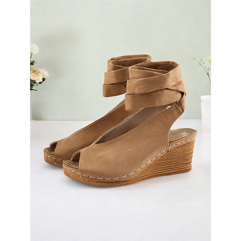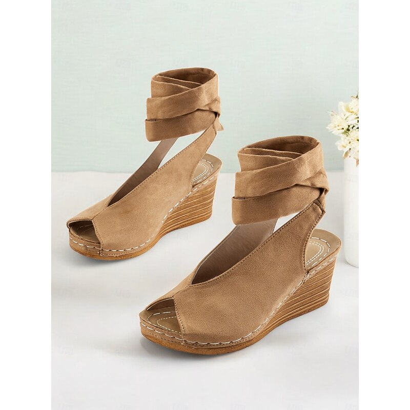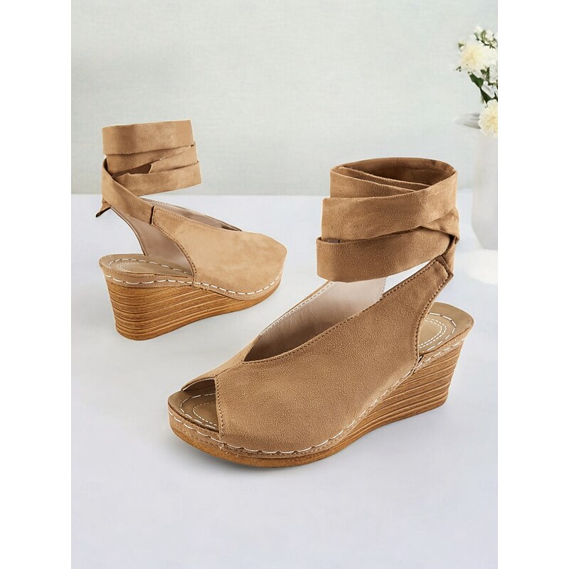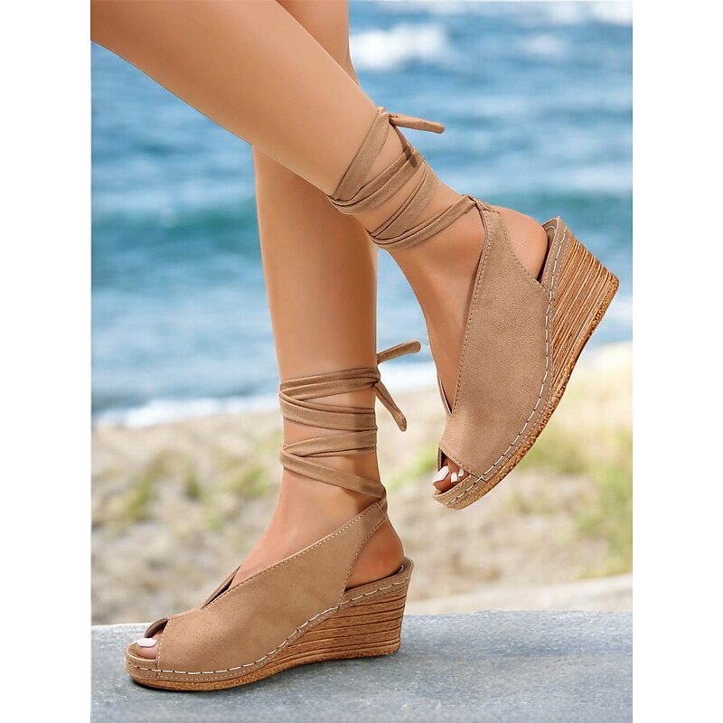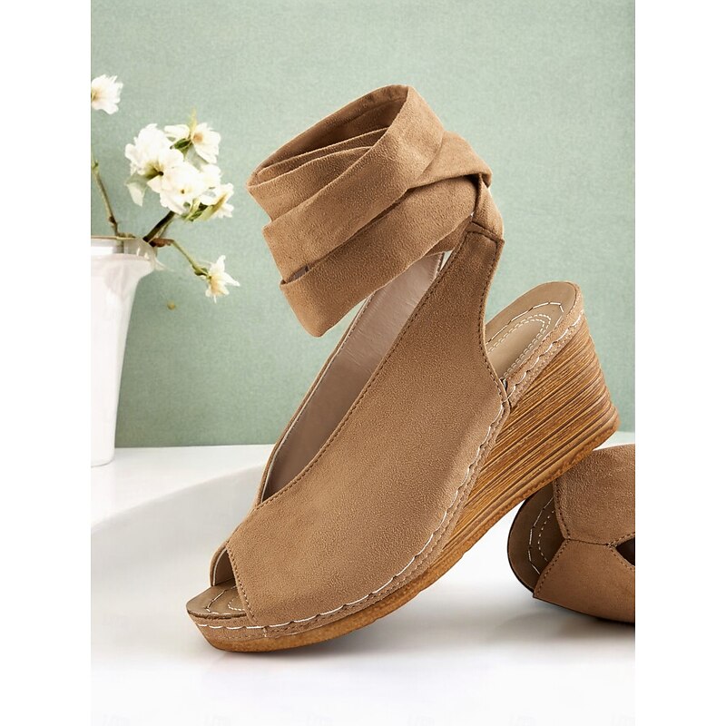 HOT ! Women's Khaki Faux Suede Wedge Sandals with Peep-Toe and Wraparound Ankle Straps - Comfortable Summer Shoes for Casual and Beach Wear