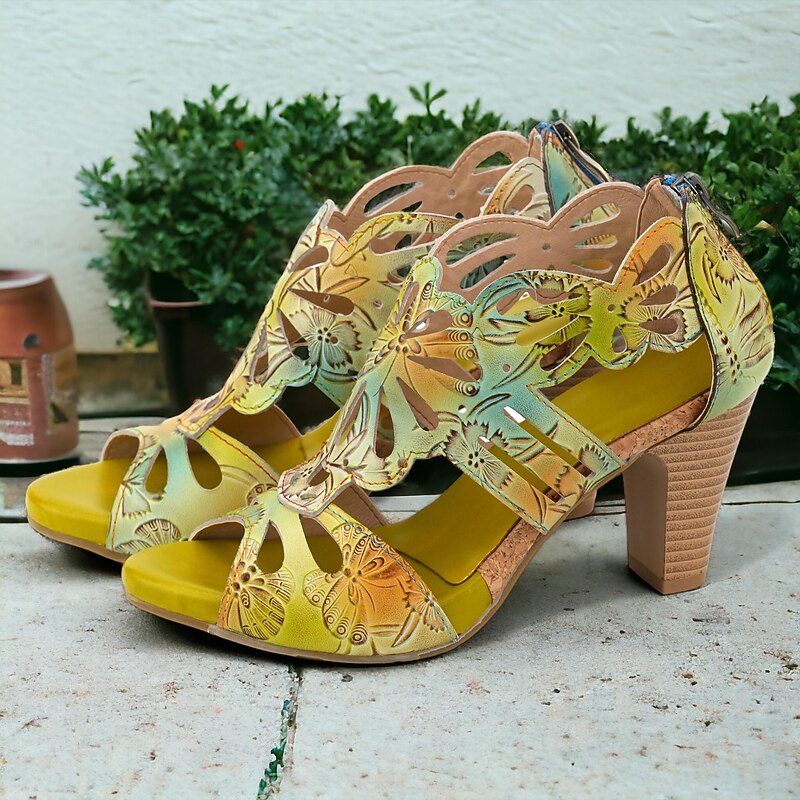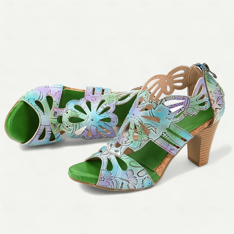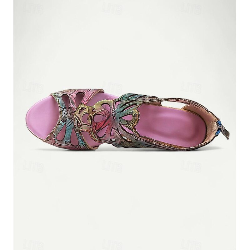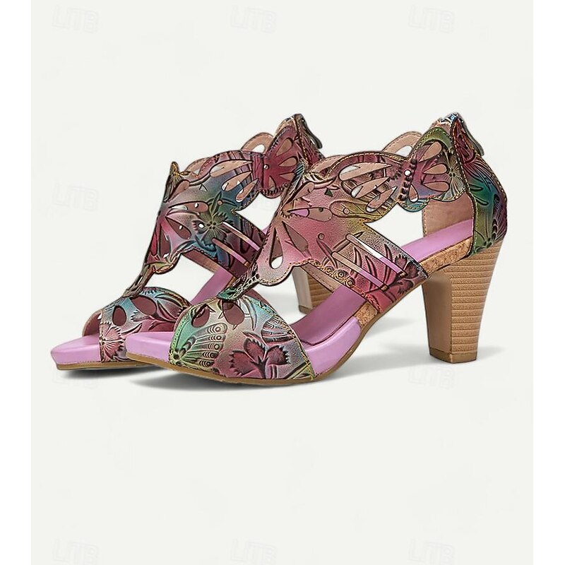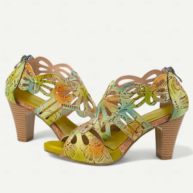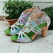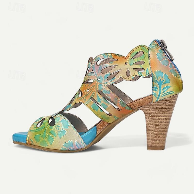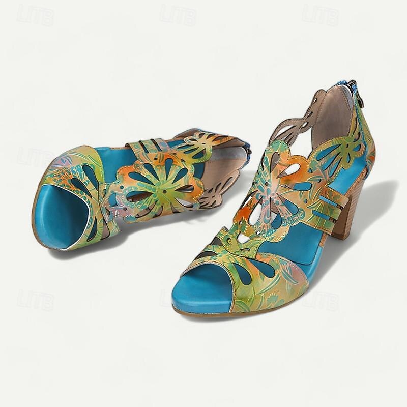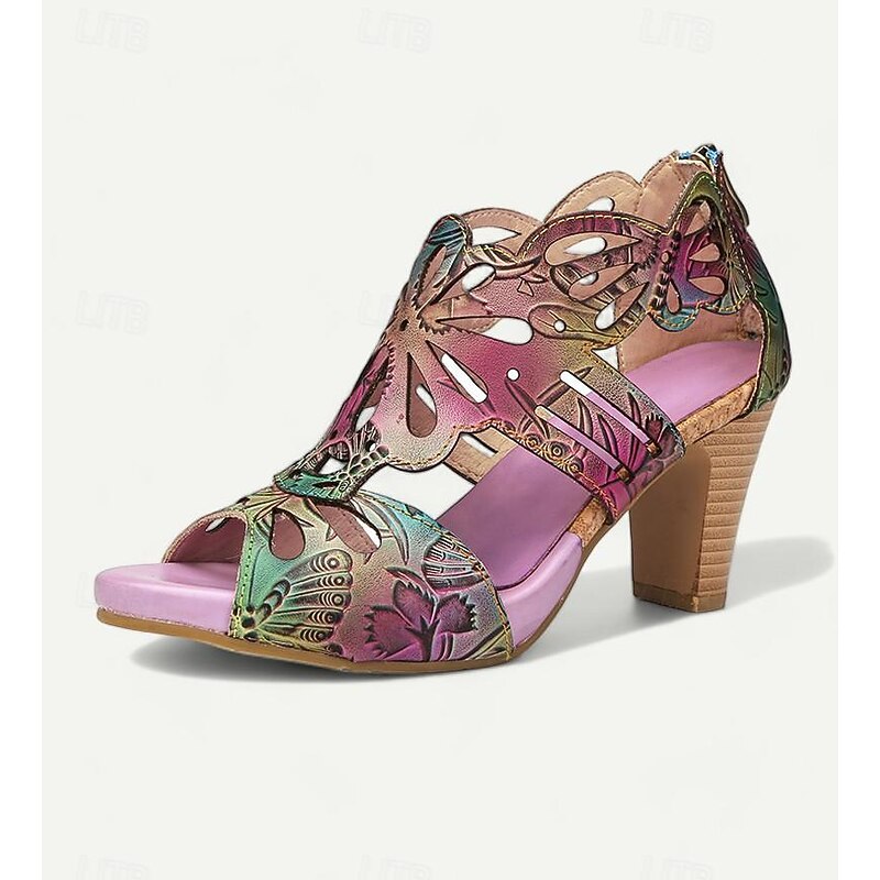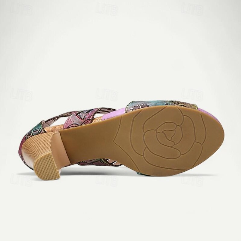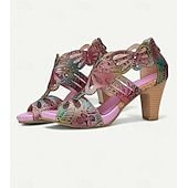 Highlights [Fabric] : Crafted from 100% premium cowhide, these elegant women's sandals feature a quality upper material that offers durability and a luxurious feel. The inner lining uses synthetic leather for added comfort and reliability throughout the day. [Style] : With a vintage design that incorporates a cone heel, chunky heel, and platform, these sandals perfectly combine elegance with stability. The peep toe adds a touch of sophistication, making them a versatile addition to any wardrobe. [Design Highlights] : The sandals showcase intricate cutout patterns resembling floral motifs that enhance their artistic appeal. The vibrant multicolored upper includes shades of purple, yellow, and light purple, complemented by a deep purple inner lining for bold contrast. A convenient zipper closure ensures easy wearability. [Occasions] : Ideal for various settings, these sandals can effortlessly elevate casual outings or special occasions. Whether you’re attending a summer party, exploring the city, or enjoying a leisurely weekend, these sandals provide both comfort and style. [Size Notice] : Available in a range of sizes from US6 to US12, these sandals cater to a wide spectrum of foot sizes, ensuring a perfect fit for different preferences and needs.
