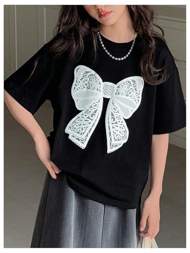 HOT ! SHENHE Girl's Cute Bow Shirt Oversized Graphic Crew Neck Half Sleeve Summer Tee Top