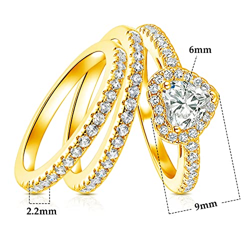 3 Pairs Heart Halo Wedding Rings Set Engagement Ring 18K Yellow Gold Plated Cubic Zirconia Band Promise Eternity Ring for Women Size 9 6