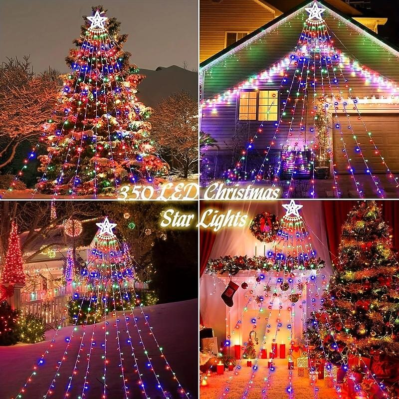 11.5FT 350LED Solar Star String Light Outdoor, Waterfall Lights, Christmas Tree Lights, Easy Installation, Waterproof Christmas Lights For Yard Christmas Decorations Wedding Party Home Garden 12