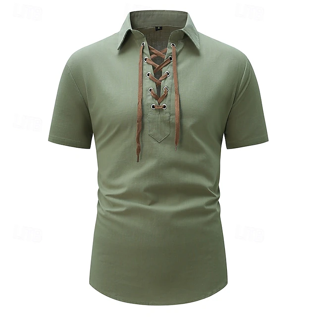 Men's Shirt Linen Shirt Viking Style Summer Shirt Beach Wear Pirate Shirt Solid Color Outdoor Vacation White Sky Blue Green Dark Gray Short Sleeve Shirt Collar Summer Spring Clothing Apparel 15
