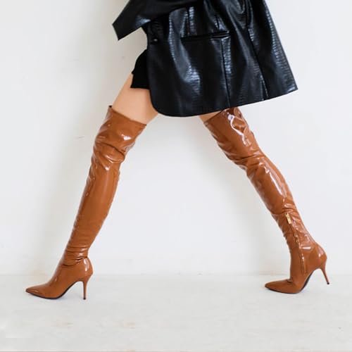 • FASHION DESIGN: brown thigh high boots is feature with Stretch fabric,a pointed toe and a stiletto heels.It's Embellish your leg lines, Multiple fabrics and colors to choose from.