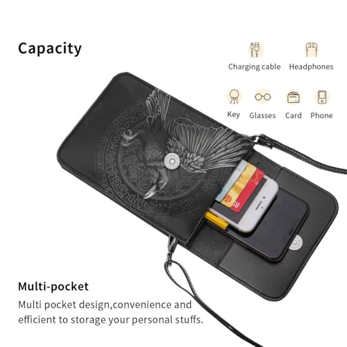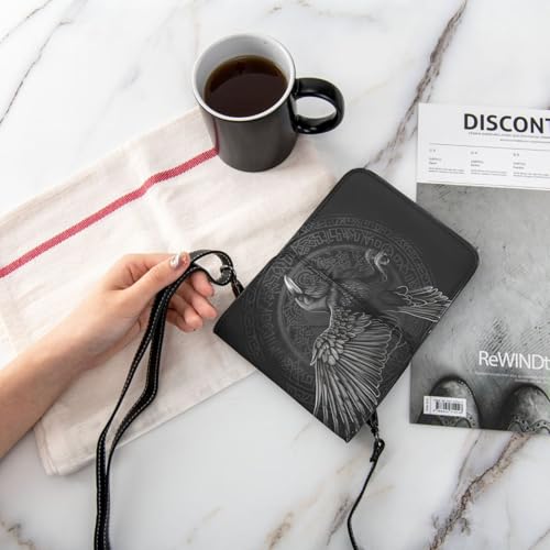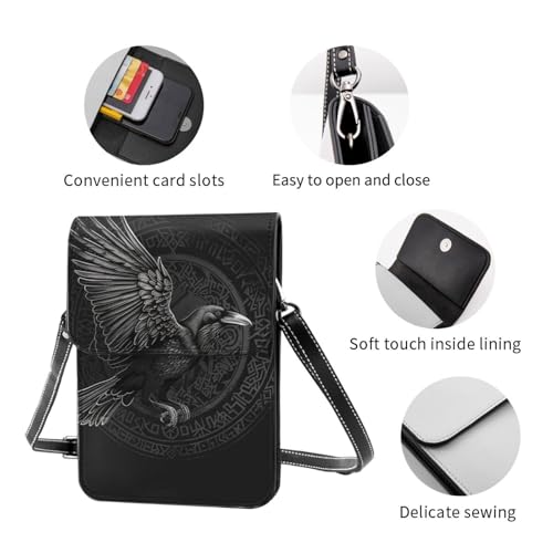 HOT ! Crow raven celtic viking design gothic black crossbody cell phone purse for womens lightweight small soft leather fashion travel wallet with adjustable strap