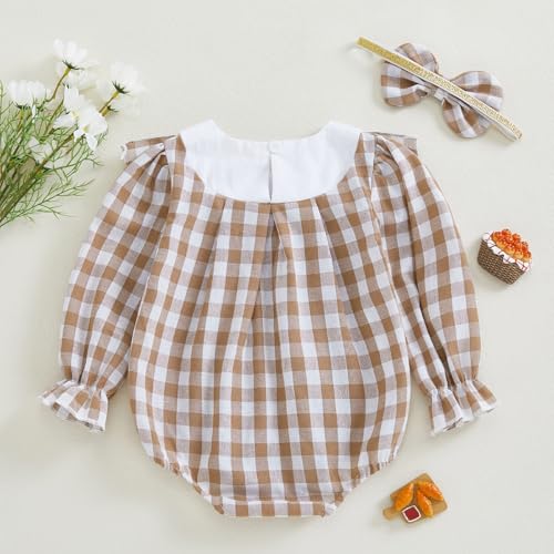 FYBITBO Newborn Baby Girl Outfits Smocked Long Sleeve Bubble Romper Plaid Bodysuit Jumpsuit Headband Infant Clothes Set 1