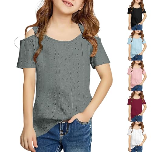 HOT ! Girls Cold Shoulder Eyelet Blouses Short Sleeve T-Shirts Cotton Tees for Tween Girls Trendy T-Shirt Loose Casual Tops